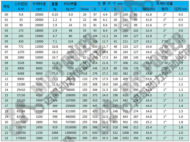 1、補償兩軸線不對中的能力強,與齒式聯(lián)軸器相比角位移可大一倍,徑向位移時反力小,撓性大,允許有的軸向、徑向和角向位移。